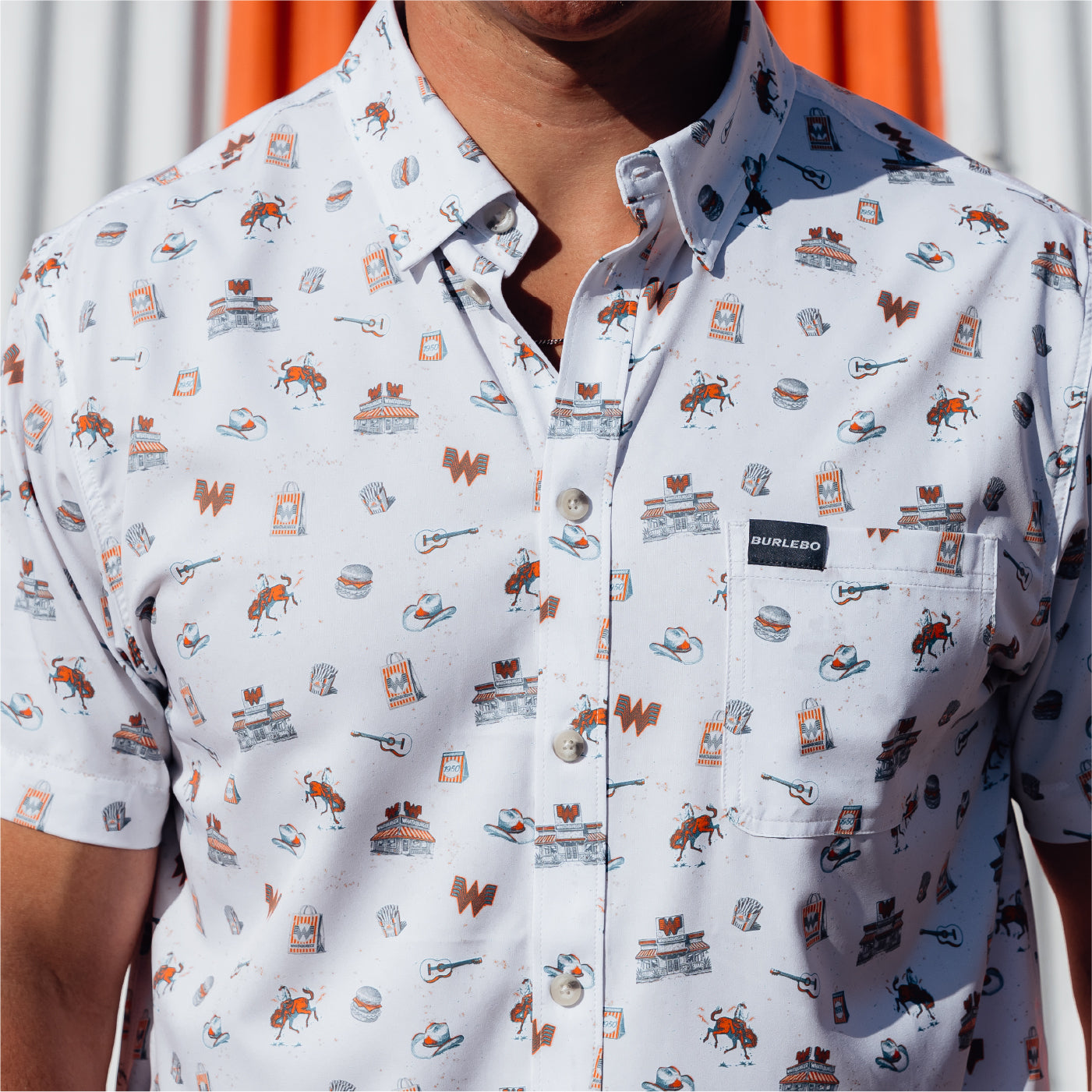 Our Limited Edition BURLEBO x WHATABURGER COLLECTION. Constructed from a lightweight performance fabric, our Performance Button Up is designed to keep you cool and comfortable all day long. The breathable, quick-dry, and moisture-wicking properties ensure you stay dry and fresh, while the four-way stretch fabric provides maximum flexibility and mobility.