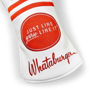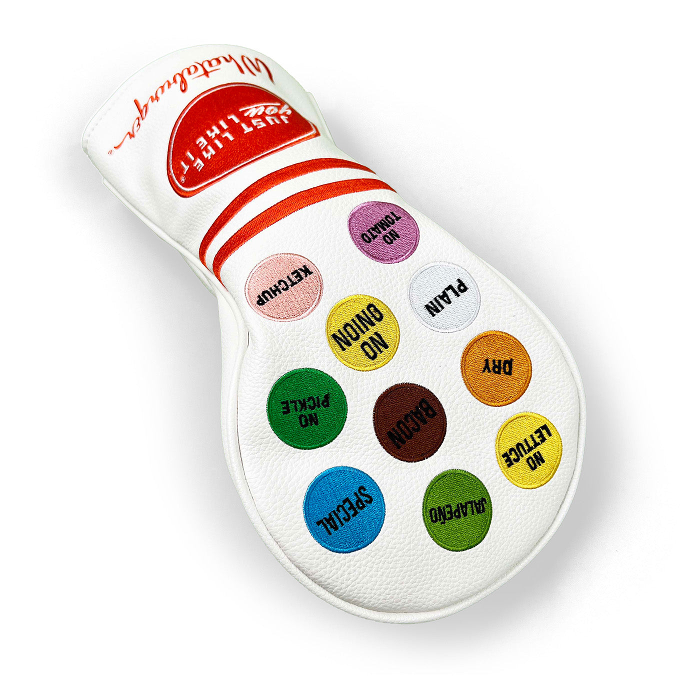 Look sharp and get ‘teed-off’ with style with our spiffy Golf Head Cover! This club cover can fit drivers or woods and is sure to turn heads on the green with it’s bright orange and white coloring and embroidered sandwich sticker accents. Plus, it’s crafted with elastic to keep your clubs secure and stylish while you show off your smooth swings. So go ahead and hit ’em straight!