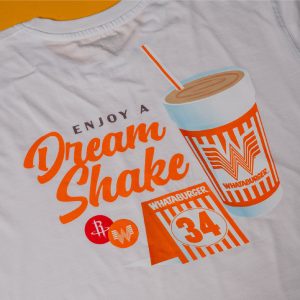 Designed to go from courtside to curbside—and everywhere in between—the Houston Rockets x Whataburger collab fuses bold style and easy, laid-back wearability. The Dream Shake White Tee is aWhite pocket tee inspired by Hakeem Olajuwon’s signature move with references to Whataburger shakes and his number as a Whataburger table tent.