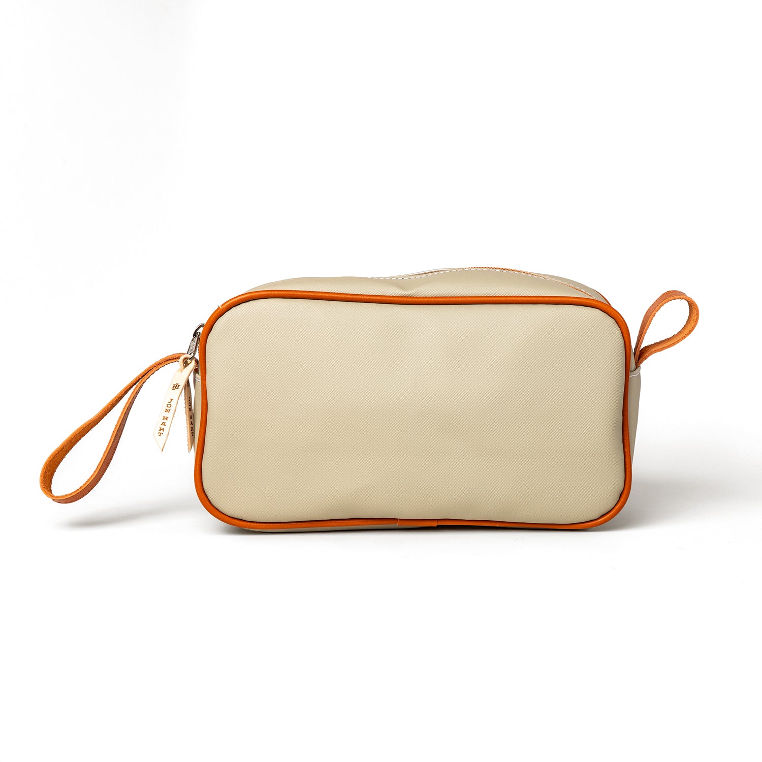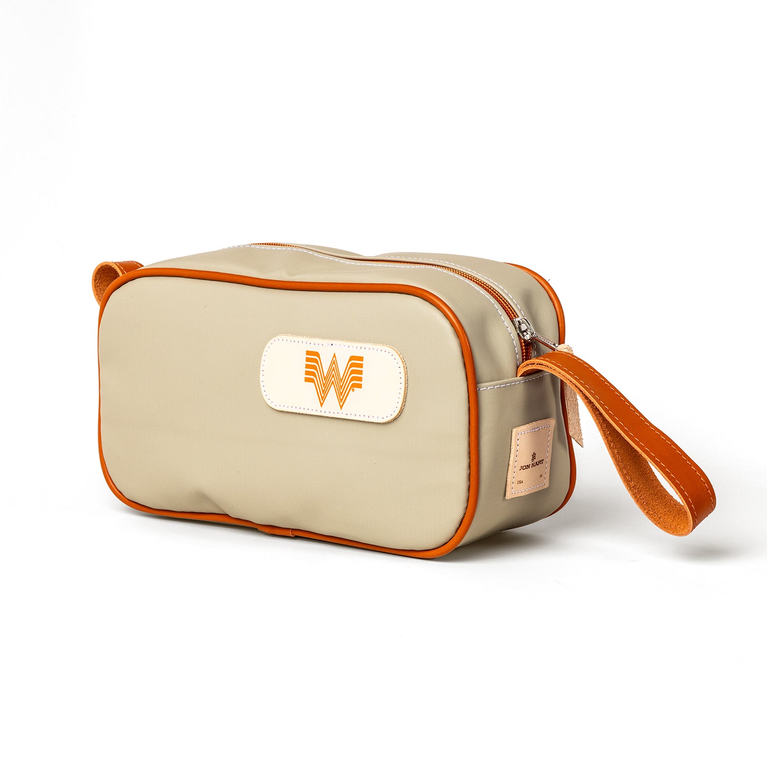 A perfect toiletry kit for travel. This limited-edition Whataburger shave kit featuring a tan coated canvas and orange natural leather trim can carry all your essentials. Also great for carrying meds and electronics accessories.