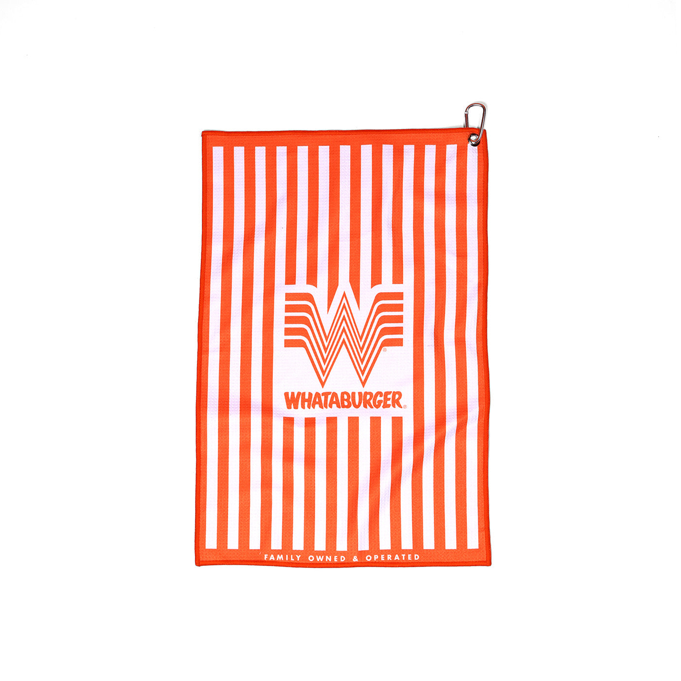 Score a hole in one with this Whataburger golf towel! The orange and white stripe design adds style to your game, while the polyester waffle material quickly absorbs moisture and keeps your clubs clean. Perfect for any avid golfer looking to have fun on the course.